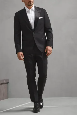 For Men: Black tuxedo or a formal, well-fitted dark suit (black/navy).